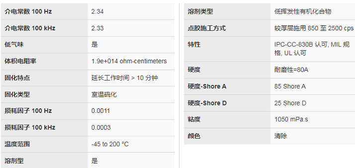 单组分、透明,可以通过轻微加热加快湿气RTV固化、坚硬光滑的表面具有耐磨性、溶剂型(在许多区域挥发性有机化合物被免除)、UL和军用规格、含有UV指示剂