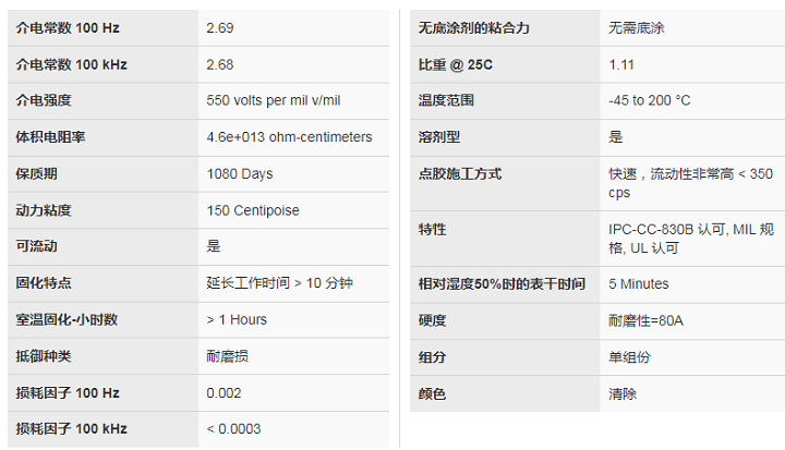 单组分、透明、可以通过轻微加热加快湿气RTV固化、低粘度、坚硬光滑的表面具有耐磨性、溶剂性、UL和军用规格、含有UV指示剂。