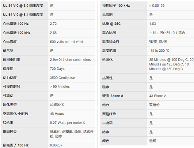由双组分组成、透明、10:1、室温和热回化、高强度、符台UL和M规格,与 SYLGARD②182相同但室温面化更快