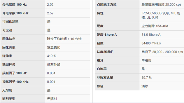 单组分,半透明的粘合剂或涂层,具有良好的流动性,高的振动/机械冲击伸长率值,减震,低应力,良好的阻燃性,已通过UL,IPC和Mil Spec测试,包含紫外线指示剂。