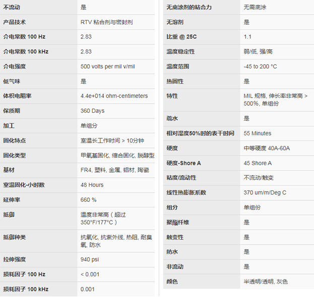 陶熙3145RTV粘合剂/密封剂-透明:半透明;单组分,无需混合;室温湿气固化,无需烘炉;无溶剂,无需通风;固化系统可以通过加热加速,以便提高在线处理速度;涂敷之后不流动; Mil Spec A-46146 QPL(合格产品名录);高抗拉强度; 延伸率高,可缓冲振动/机械冲击,降低应力。